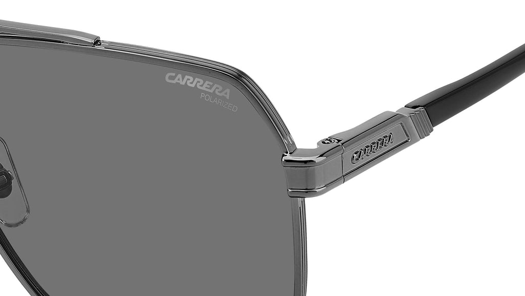 Occhiali da sole Carrera modello 1055/S colore V81 M9 dark ruthenium black. Questi occhiali da sole per uomo trasformano le signature tipiche Carrera in elementi accattivanti. Il profilo in metallo è iconico con il suo gioco di pieni e di vuoti, dati dal doppio ponte e la placca con la "C". Anche le aste sanno distinguersi, grazie al design scolpito, il logo in altorilievo e i terminali lunghi in acetato. Le lenti squadrate sono disponibili in versione sfumata, polarizzata oppure Ultrapolar con coating dorato.