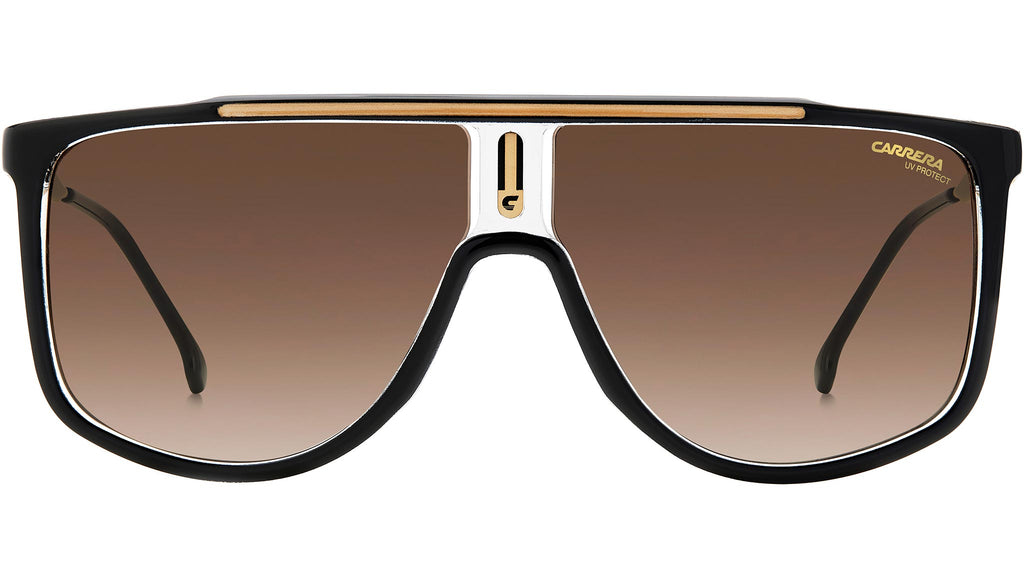 Occhiali da sole Carrera modello 1056/S colore 2M2 HA black gold. Ritornano alle origini dello stile Carrera questi occhiali da sole con silhouette bold, dal forte impatto visivo. Le maxi-lenti sono protagoniste, esasperate dall’inserto cromatico sul flat-top e dalla placca centrale con la “C” Carrera. Le aste in metallo con il logo lettering e la bandiera a contrasto completano questo modello dall’identità distintiva, disponibile anche in versione polarizzata.