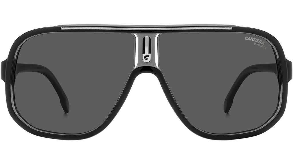 Occhiali da sole Carrera modello 1058/S colore 08A M9 black grey. Questi occhiali da sole uomo hanno un forte richiamo rétro per via della montatura navigator, così predominante nella storia Carrera. Realizzati in poliammide iniettata, presentano tonalità neutre con accostamenti cromatici a contrasto, il più significativo dei quali è la bandiera del brand lungo le aste. Disponibili con lenti sfumate o tinta unita polarizzate, sempre avvolgenti e schermanti, indimenticabili grazie all’inserto con la “C” Carrera.