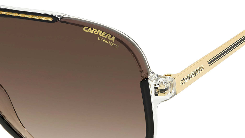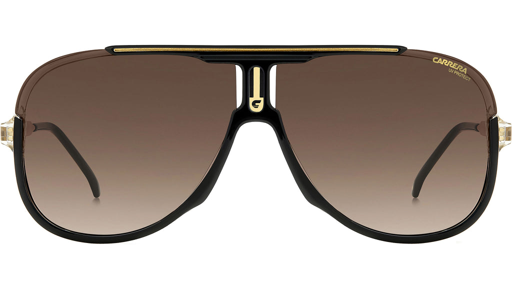 Occhiali da sole Carrera modello 1059/S colore 2M2 HA black gold. Nella migliore tradizione Carrera, questi occhiali da sole esprimono la libertà di raccontarsi in modo autentico. Cattura l’attenzione il frontale oversize, ancora più incisivo grazie al flat-top con la flag Carrera e il logo posto al centro. Il modello è proposto anche con frontale aperto sugli angoli in alto, lenti sfumate, specchiate, polarizzate oppure ultrapolar.