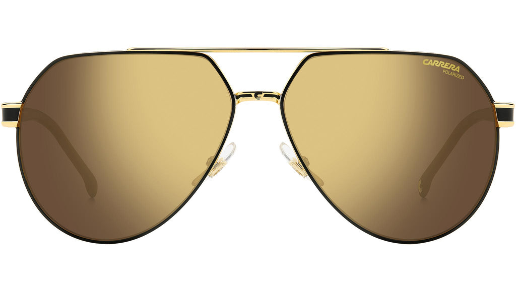 Occhiali da sole Carrera modello 1067/S colore I46 YL matte black gold. Lenti a goccia, montatura in metallo, elementi identificativi Carrera: ecco la ricetta della potenza estetica di questi occhiali da sole unisex. Il modello sfoggia un doppio ponte incisivo in vero stile Carrera, rimarcato dal logo laserato sulla parte superiore. Tra le qualità tecniche rientrano le cerniere flessibili e la possibilità di montare lenti graduate. Disponibile in versione polar e ultrapolar con coating dorato.
