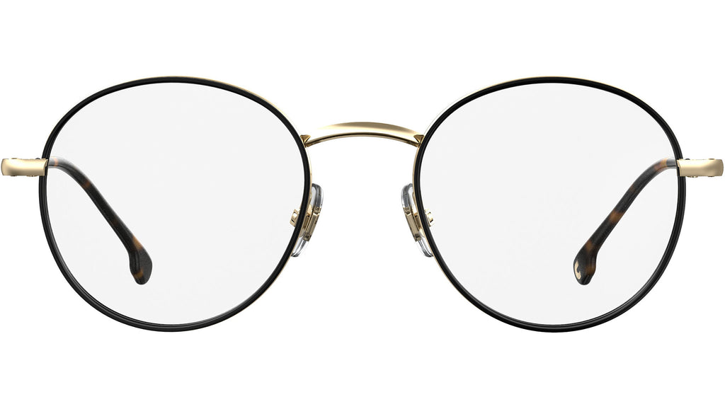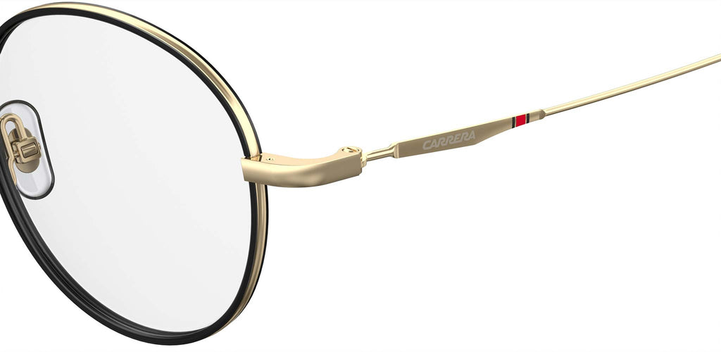 Occhiali da vista Carrera modello 157/V colore RHL gold black. I Carrera 157/V sono un modello di occhiali da vista da uomo tondi in acciaio inossidabile e acetato. Il design è caratterizzato dalla presenza del logo inciso a bassorilievo accanto alla bandiera del brand, nella parte sinistra della montatura.