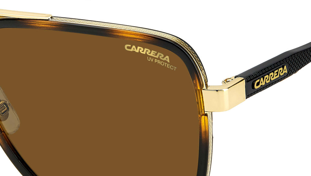 Ispirazione vintage, aggiornata con uno sguardo contemporaneo. Questi occhiali da sole da uomo porteranno un tocco Carrera nelle tue giornate di sole. Il design grintoso con doppio ponte combina uno strato di metallo leggero con il frontale e le aste in poliammide iniettata, creando un accattivante contrasto. Da notare i dettagli logati e l’iconica texture a griglia Carrera – un sofisticato effetto tridimensionale nella parte esterna delle aste – che completano il look con un’ulteriore dose di fascino.