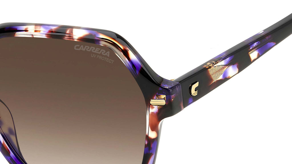 Occhiali da sole Carrera modello 3026/S colore HKZ HA violet havana. Carrera sceglie geometrie soft e ispirazioni retrò per questi occhiali da sole donna. Gli elementi tipici del brand diventano gioielli che impreziosiscono la montatura: i rivetti in metallo dorato sul frontale e la “C” in rilievo sulle aste. La struttura è in acetato, declinata in diverse opzioni colore che includono sfumature, trasparenze e havana colorata. Le lenti sono personalizzabili con la gradazione preferita, disponibili anche in versione specchiata.