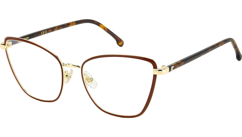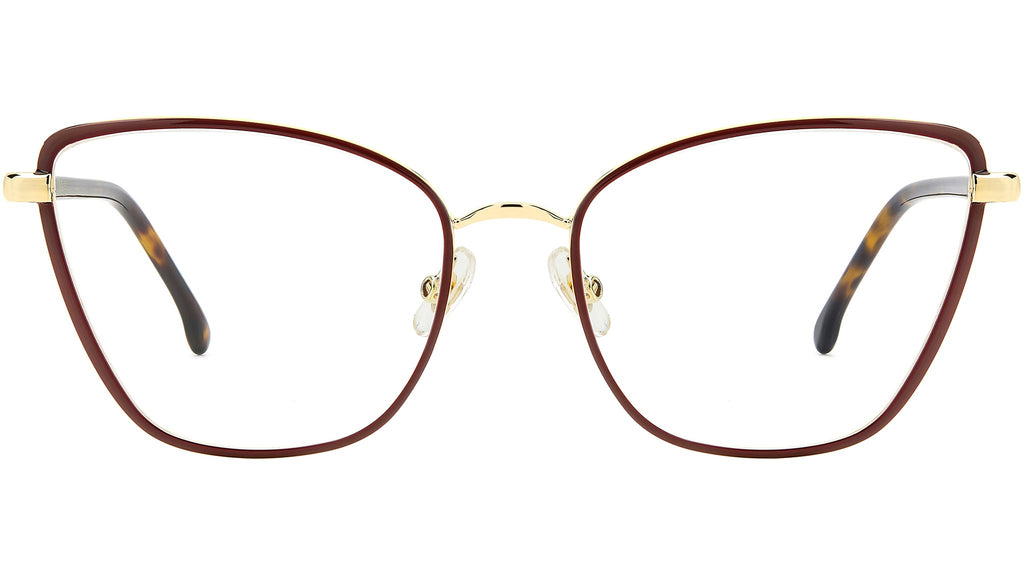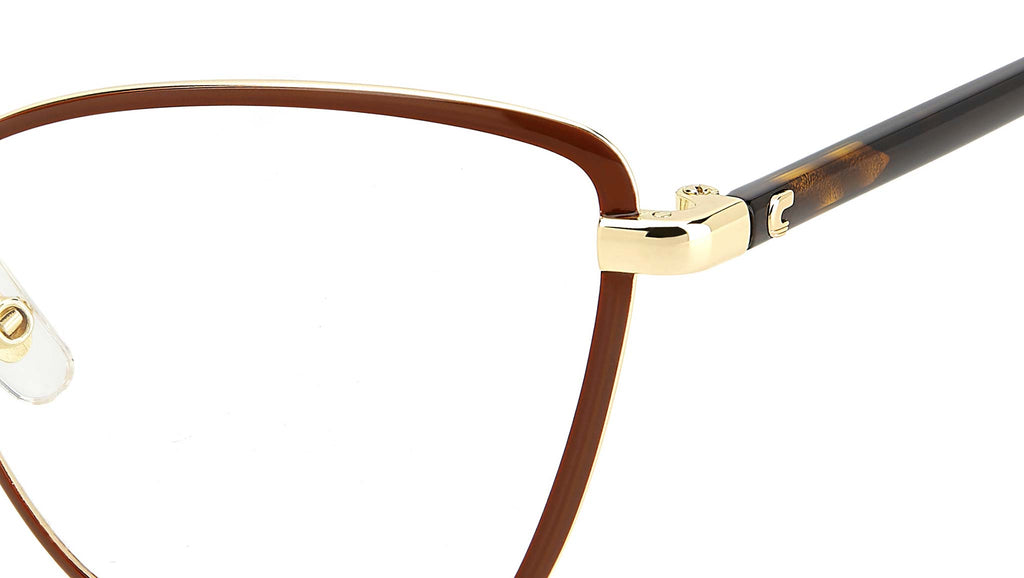 Occhiali da vista Carrera modello 3039 colore E28 matte burgundy gold. Uno stile misurato eppure contemporaneo per questi occhiali da vista Carrera per donna. La silhouette cat-eye è in metallo, disponibile anche in versione colorata, essenziale ma notevole, un omaggio all’heritage Carrera reinterpretato per la moda di oggi. Le aste presentano terminali lunghi in acetato, e il logo “C” in metallo, con un mix di materiali che eleva il modello. La leggerezza della costruzione e i naselli regolabili assicurano comfort impareggiabile.
