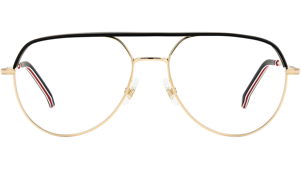 Occhiali da vista Carrera modello 311 colore W97 gold striped black. Per chi ama il modello pilot, Carrera propone occhiali da vista dall’animo vintage. La struttura in metallo è incisiva grazie al doppio ponte sopra le lenti, rivestito di acetato per un gioco di contrasti materici e cromatici. Le aste sono essenziali ma minuziose: presentano un design a pinna emblematico dell’heritage Carrera, cerniere scolpite e terminali in acetato anche in versione multistrato.
