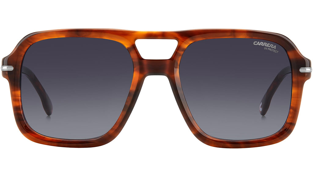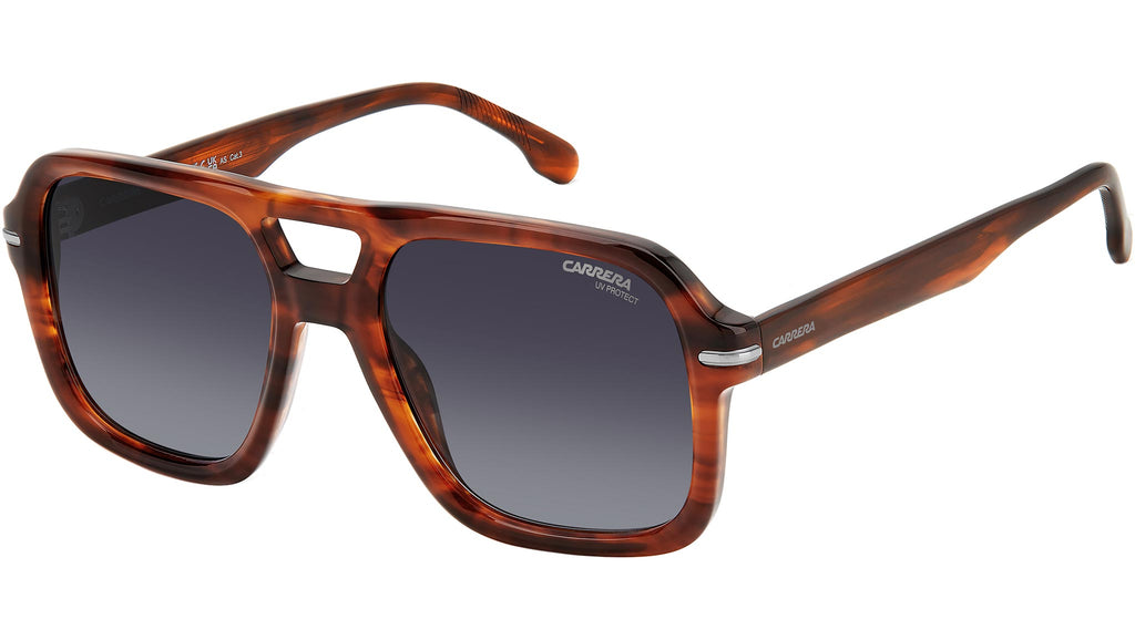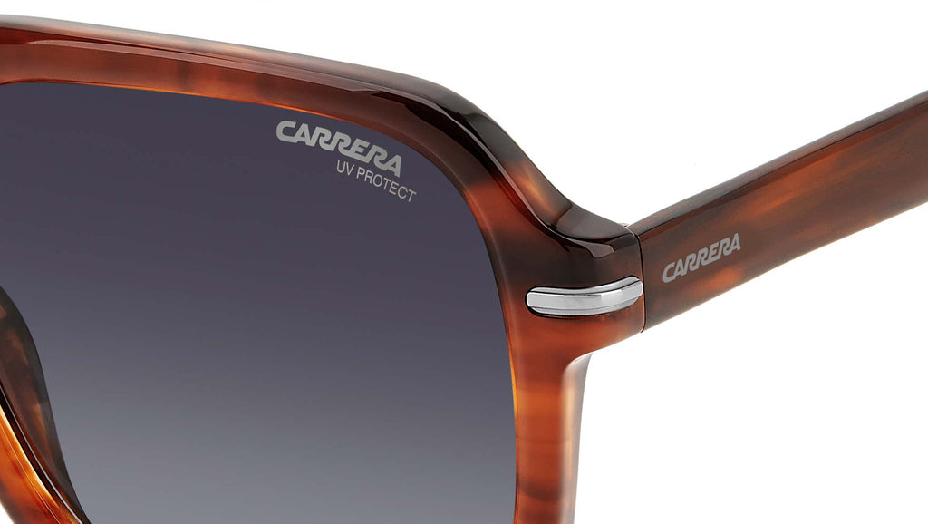 Occhiali da sole Carrera modello 317/S colore EX4 9O brown horn. I riflettori sono puntati su questi occhiali da sole dai volumi importati, plastici e scolpiti. Uno degli stili Carrera più amati – la shape navigator con doppio ponte – viene realizzato in acetato, completato da aste slanciate e inserti metallici scolpiti a lato delle lenti. La palette colori comprende versioni multistrato e trasparenti con anima lavorata a vista. Possibilità di montare lenti graduate.
