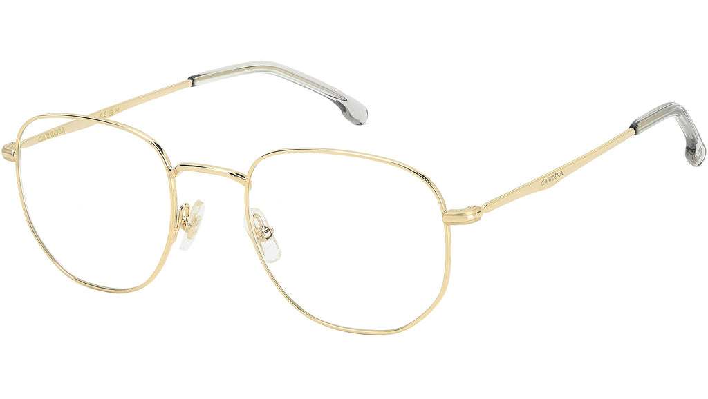 Occhiali da vista Carrera modello 323 colore J5G gold. Linee pure e dettagli minuziosi per questi occhiali da vista Carrera, garanzia di un look pulito e senza tempo. La shape geometrica caratterizza la montatura sottile, interamente in metallo. Le aste a pinna si agganciano al frontale con cerniere scolpite, e sono completate da terminali in acetato anche in versione multistrato o trasparente. Il modello è disponibile anche con profilo colorato sul frontale.