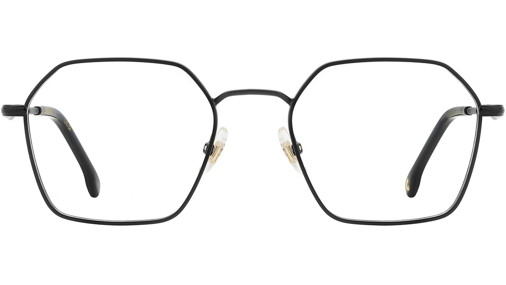 Occhiali da vista Carrera modello 335 colore 003 matte black. Allure vintage e stile intramontabile per questi occhiali da vista Carrera dai profili sottili. Indimenticabile la silhouette del frontale, vagamente esagonale, leggera sul volto perché realizzata in acciaio inossidabile. Le aste in metallo sono scolpite della classica shape a pinna, eredità del design storico Carrera. Il brand è esplicitato nella firma laserata e nella bandiera che colora i terminali multistrato. Disponibile in più varianti colore, anche con frontale smaltato.