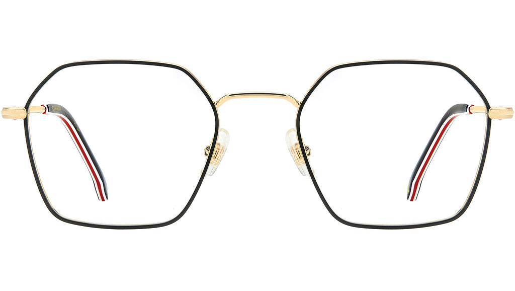 Occhiali da vista Carrera modello 335 colore 2M2 black gold. Allure vintage e stile intramontabile per questi occhiali da vista Carrera dai profili sottili. Indimenticabile la silhouette del frontale, vagamente esagonale, leggera sul volto perché realizzata in acciaio inossidabile. Le aste in metallo sono scolpite della classica shape a pinna, eredità del design storico Carrera. Il brand è esplicitato nella firma laserata e nella bandiera che colora i terminali multistrato. Disponibile in più varianti colore, anche con frontale smaltato.