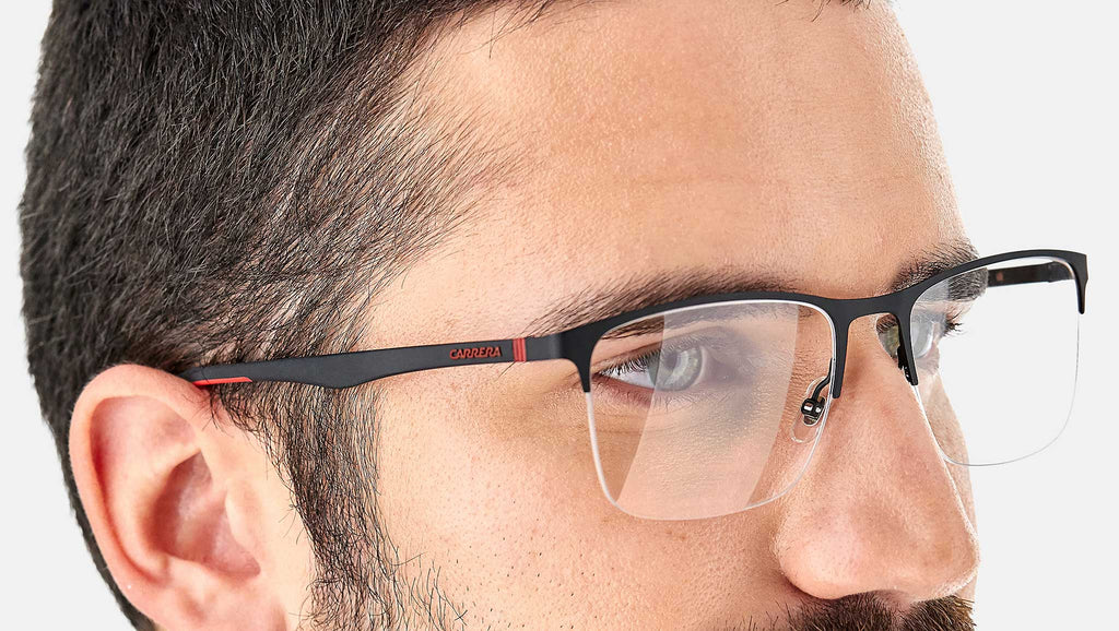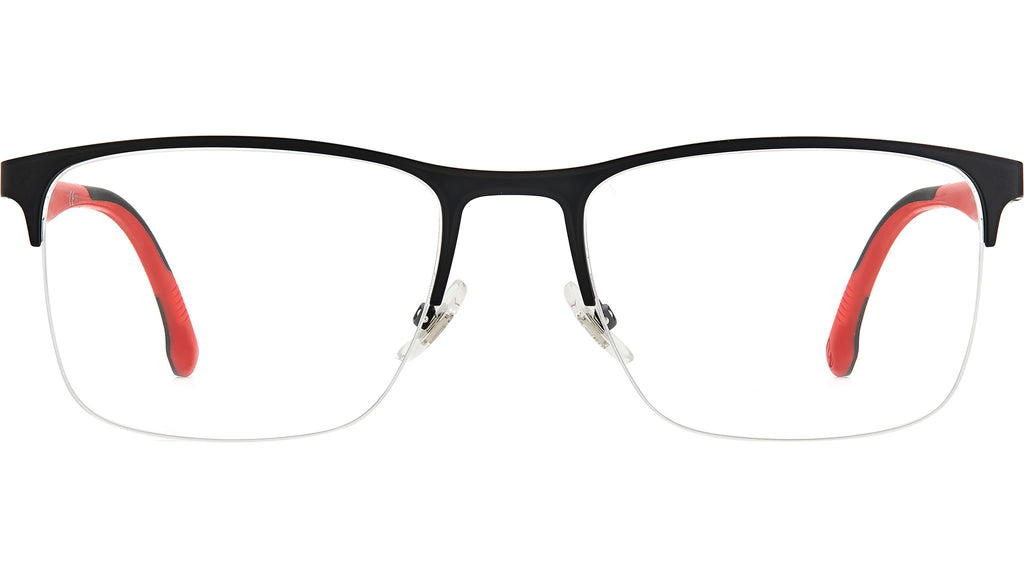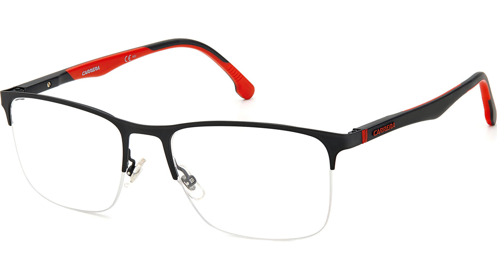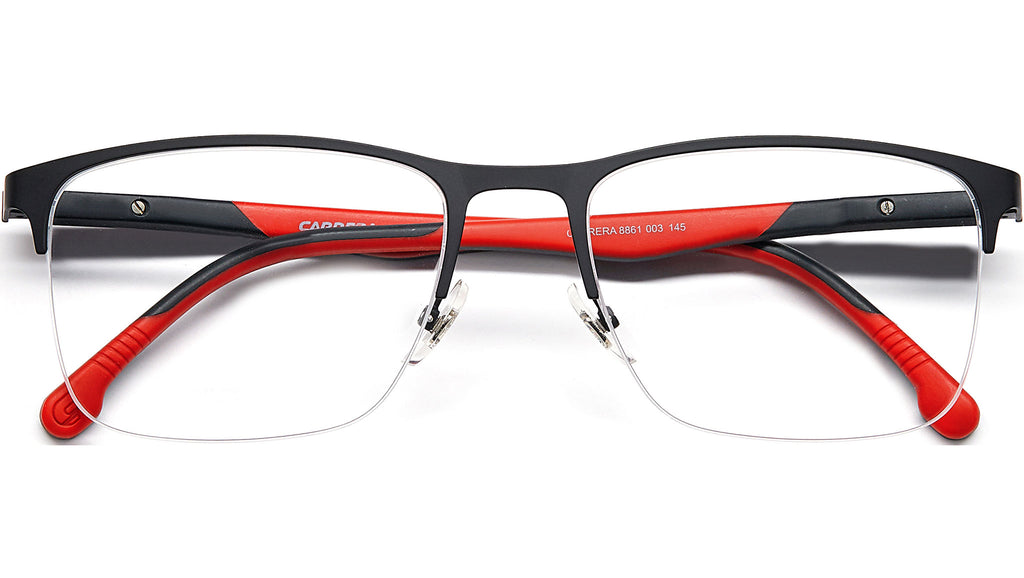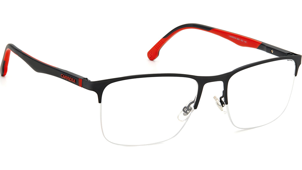 Occhiali da vista Carrera modello 8861 colore 003 matte black. La competenza tecnica e un’estetica distintiva Carrera si affiancano in questi occhiali da vista da uomo. Il design a doppia iniezione è un vero statement di stile moderno, grazie al profilo rettangolare senza montatura. Gli inserti in gomma Megol sui naselli e nella parte centrale interna delle aste ottimizzano l’aderenza e il comfort, mentre le cerniere flessibili integrate garantiscono un fit sicuro e di supporto.