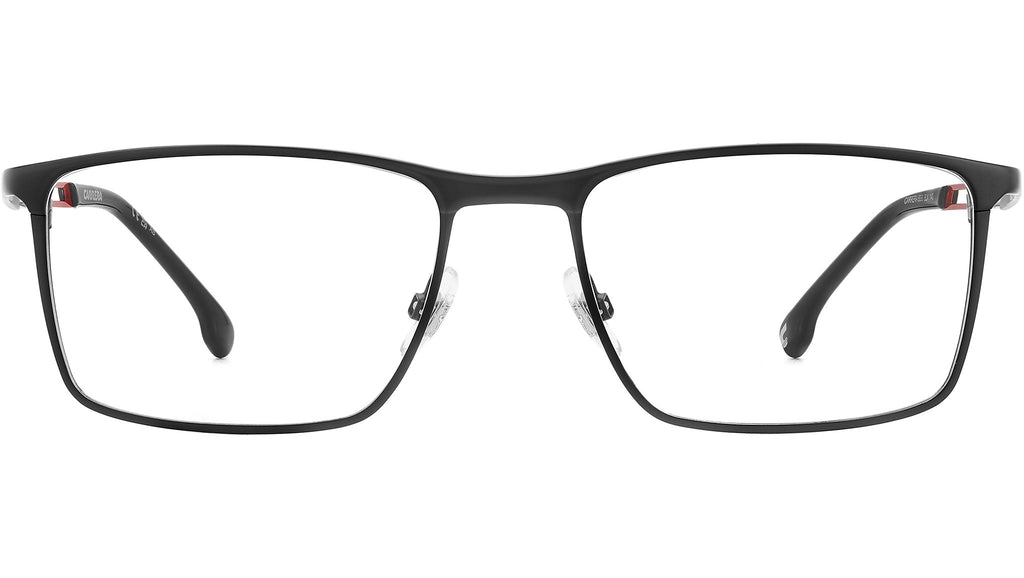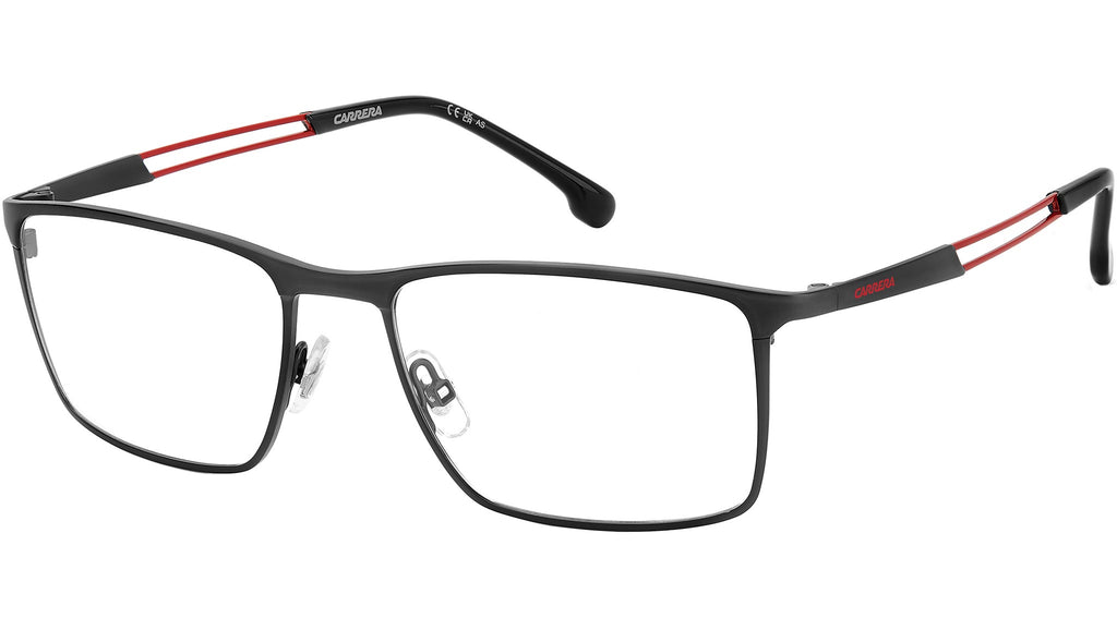 Occhiali da vista Carrera modello 8898 colore BLX matte black red. Ancora una volta Carrera riscrive le regole e trasforma i più essenziali occhiali da vista in un accessorio dalla personalità dinamica, tecnica e grintosa. Ecco allora il frontale con naselli, realizzato in metallo, le cui linee sottili e minimali accentuano il comfort incomparabile. Inconfondibili le aste: l’apertura conferisce leggerezza e la sua colorazione a contrasto è abbinata al logo Carrera.