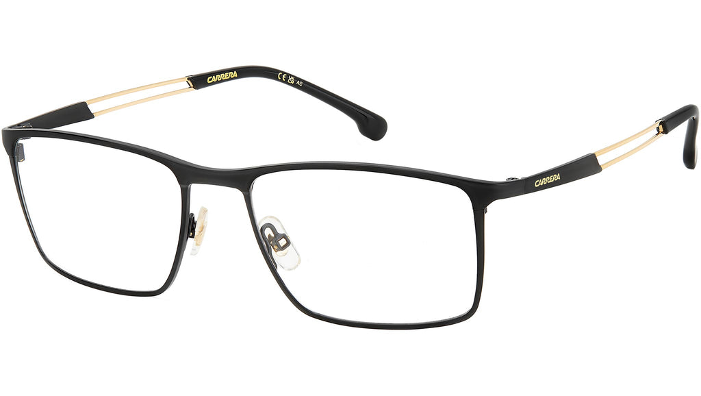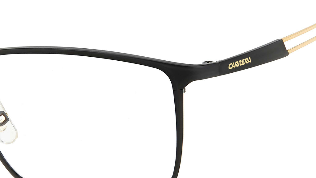 Occhiali da vista Carrera modello 8898 colore I46 matte black gold. Ancora una volta Carrera riscrive le regole e trasforma i più essenziali occhiali da vista in un accessorio dalla personalità dinamica, tecnica e grintosa. Ecco allora il frontale con naselli, realizzato in metallo, le cui linee sottili e minimali accentuano il comfort incomparabile. Inconfondibili le aste: l’apertura conferisce leggerezza e la sua colorazione a contrasto è abbinata al logo Carrera.