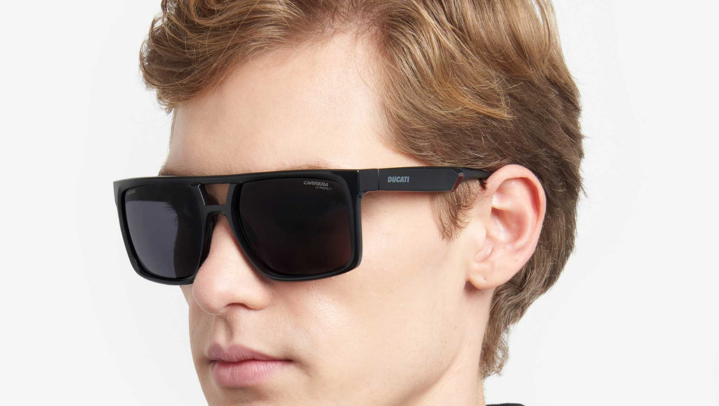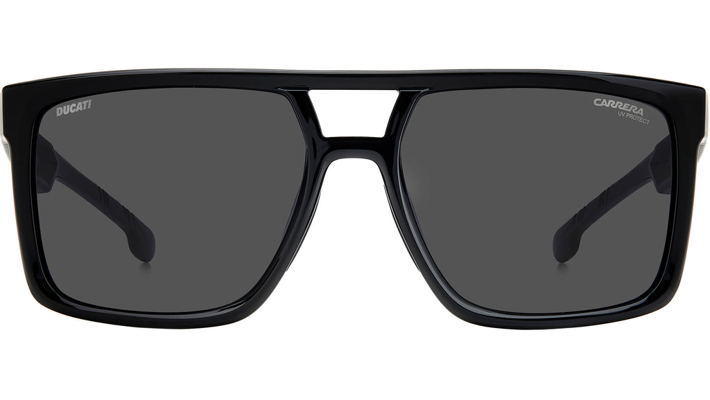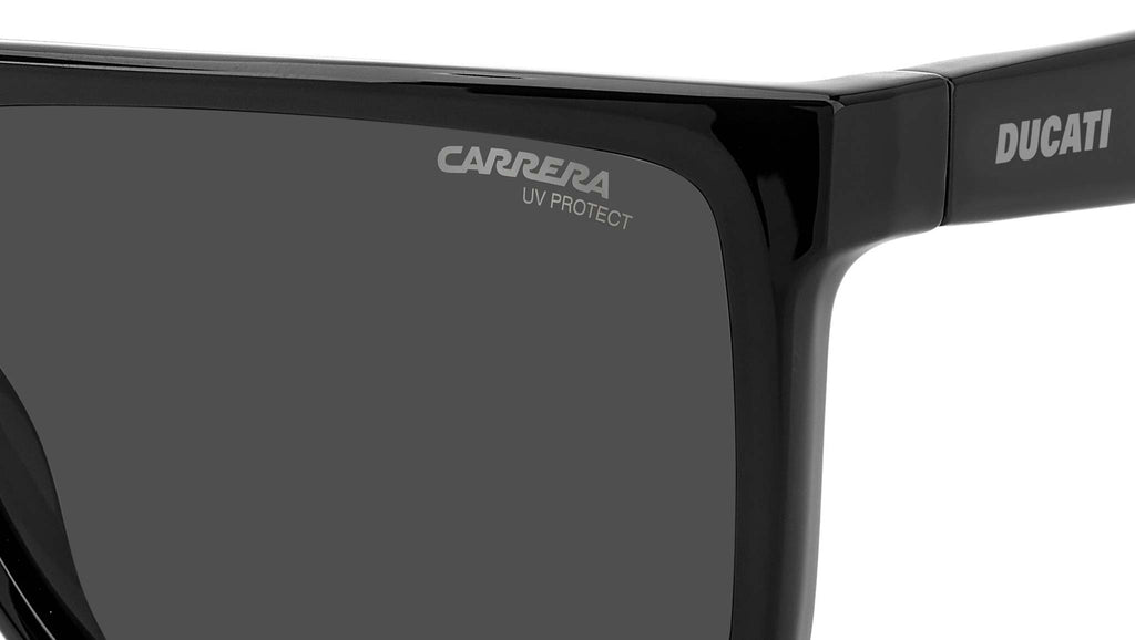Occhiali da sole Carrera Ducati modello CarDuc 018/S colore 807 IR black. Fusione perfetta di signature iconiche e design performante, questi occhiali da sole rappresentano al meglio la collaborazione tra Carrera e Ducati. Combinano un distintivo frontale a doppio ponte e aste ergonomiche antiscivolo che richiamano il profilo della Panigale. Il modello può montare lenti graduate ed è disponibile nella versione con lenti ultrapolar, per una visibilità nitida e senza riflessi su strada e in pista.