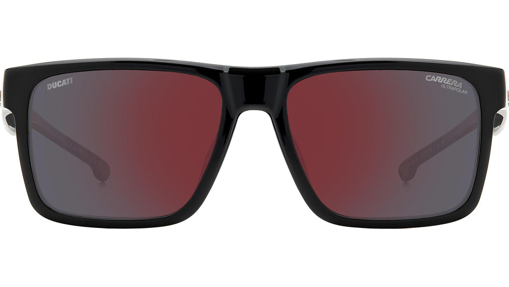 Occhiali da sole Carrera Ducati modello CarDuc 021/S colore 807 H4 black. Questi occhiali da sole conquistano con i loro dettagli grintosi e innovativi. Sulle aste spicca il sistema di ventilazione che richiama le geometrie delle moto, accompagnato dagli inconfondibili loghi Carrera e Ducati. La montatura è avvolgente, realizzata in ultem per una maggiore leggerezza e resistenza, studiata per l’utilizzo sotto il casco. Il modello può montare lenti graduate, disponibile con lenti a specchio e polarizzate, oltre che con nuova tecnologia ultrapolar.