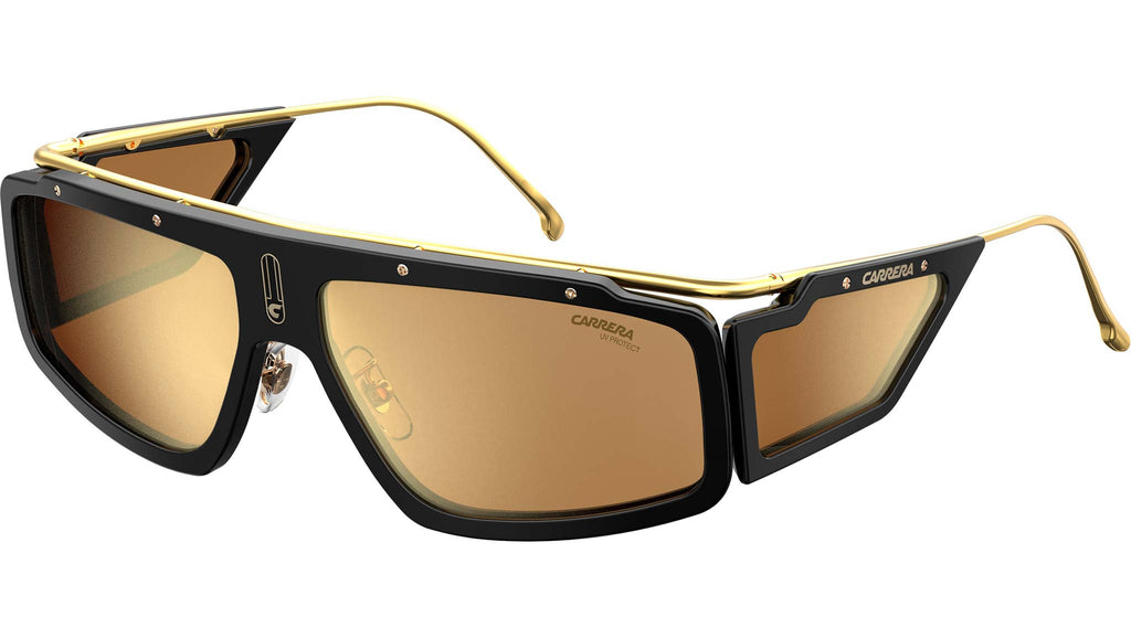 Maggiore espressione dello stile Carrera, la collezione Flag ritorna con un nuovo attesissimo modello unisex: gli occhiali da sole Facer. Realizzata in un mix di acetato e metallo e declinata qui in una variante che abbina tonalità oro a effetti tartarugati, questa montatura rettangolare a mascherina spinge l’occhialeria tradizionale verso nuovi confini. La barra superiore in metallo prosegue trasformandosi in eleganti aste, i raffinati rivetti e delle protezioni laterali dal gusto sportivo, aggiungono un tocco contemporaneo, mentre le lenti proteggono dai raggi nocivi. Inimitabili dettagli Carrera – il logo-C sul frontale e il logo lettering lungo le aste – aggiungono un tocco immediatamente riconoscibile. The Golden Touch Selection