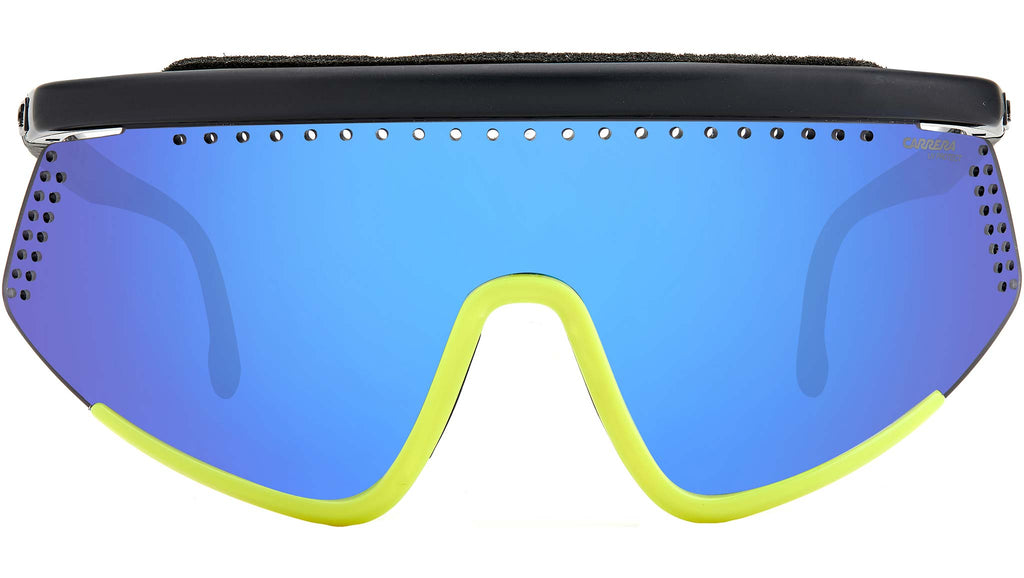 Questi occhiali da sole unisex trovano il perfetto equilibrio tra estetica e funzionalità, grazie alla silhouette parzialmente rimless e una serie di dettagli unici, volti a massimizzare la performance. La montatura pantos super leggera è scolpita in poliammide stampata a iniezione e dotata della barra superiore in schiuma, le lenti UV con una lavorazione perforata e i naselli in gomma per un fit antiscivolo. Le rivoluzionarie cerniere HyperFit assicurano libertà di movimento e flessibilità in ogni circostanza, mentre l'iconico logo sulle aste e sulla lente sinistra aggiunge una nota esclusiva. Il tocco finale è dato dal braccialetto complementare con l’iconica bandiera Carrera a righe bianche e rosse.
