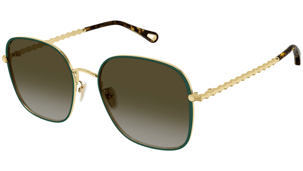 Occhiali da sole Chloé CH0255SK 002 donna con montatura rettangolare in metallo oro classico lucido + vernice petrolio solido lucido e lenti verde sfumato. Linea: Chloé. Codice modello: CH0255SK. Codice colore: 002. Made in Japan. Rivenditore autorizzato Chloé online. Gli occhiali vengono consegnati con custodia e accessori originali e sono coperti dalla garanzia ufficiale di 12 mesi del produttore.
