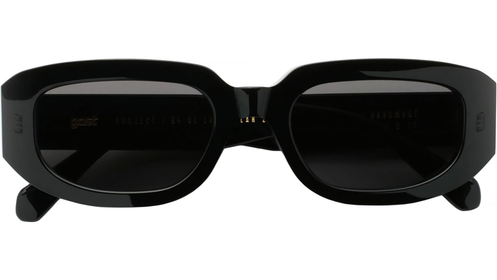 Gast AMI Black. Handmade sunglasses with black acetate frame and black semi-flat nylon lenses with anti-reflective inside coating – 100% UVA / UVB protection. Five barrels metal hinges. Premium hard case and microfiber cleaning cloth