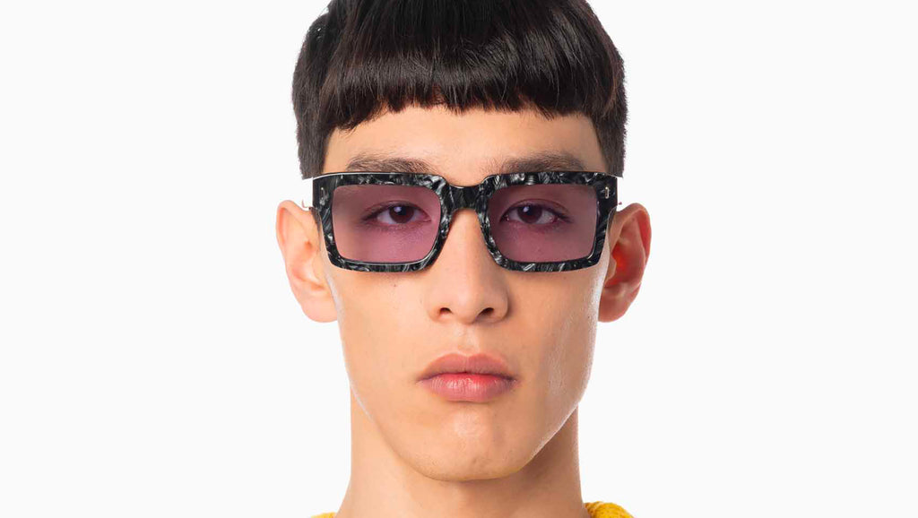 Occhiali da sole con montatura in acetato artigianale di colore nero perla e lenti viola. Materiale del telaio: acetato. Forma del telaio: quadrati. Cerniere metalliche a cinque barre e nucleo in filo personalizzato. Custodia rigida premium e panno per la pulizia in microfibra.