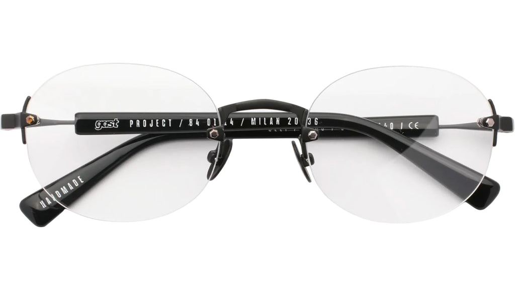 Occhiali da vista con montatura in acetato-metallo artigianale di colore nero opaco e lenti demo. Materiale del telaio: acetato-metallo. Forma del telaio: rotondi. Cerniere metalliche a cinque barre e nucleo in filo personalizzato. Custodia rigida premium e panno per la pulizia in microfibra.