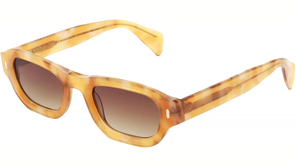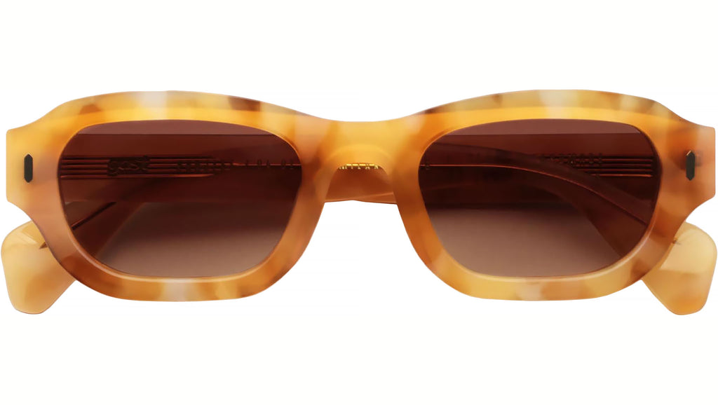 Occhiali da sole con montatura in acetato artigianale di colore ambra e lenti marrone sfumato. Materiale del telaio: acetato. Forma del telaio: geometrici. Cerniere metalliche a cinque barre e nucleo in filo personalizzato. Custodia rigida premium e panno per la pulizia in microfibra.