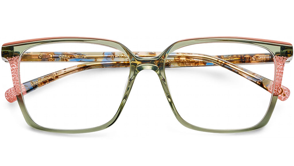 Occhiali da vista Etnia Barcelona GERA in acetato verde salvia / motivo rosa con lenti demo. Codice modello: GERA 55O. Codice colore: GRPK. Rivenditore autorizzato online Etnia Barcelona. Gli occhiali vengono forniti con custodia e accessori originali e sono coperti dalla garanzia standard del produttore di 12 mesi.