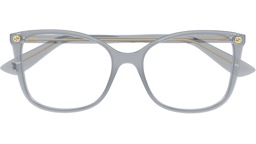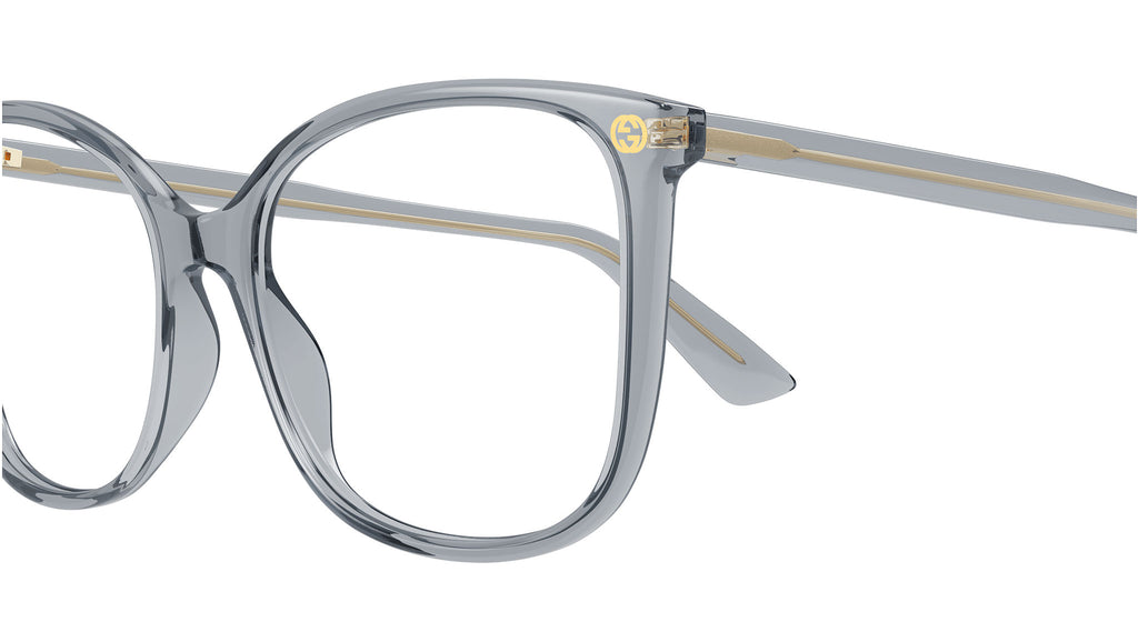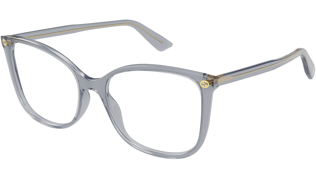 Occhiali da vista Gucci modello GG0026O linea Lettering in acetato forma a gatto codice colore 017 blu denim trasparente lucido con aste in azzurro e lenti demo. Rivenditore autorizzato Gucci online. Gli occhiali vengono consegnati con custodia e accessori originali e sono coperti dalla garanzia ufficiale di 12 mesi del produttore.