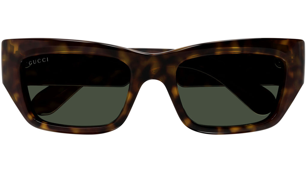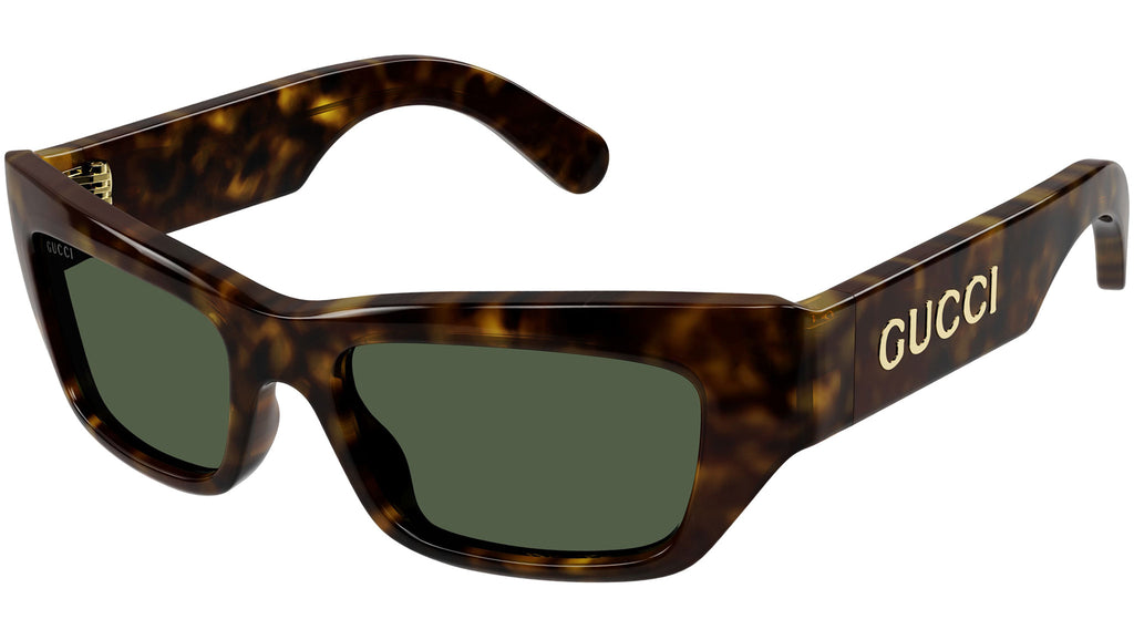 Occhiali da sole Gucci modello GG1296S linea in acetato riciclato forma a gatto codice colore 004 tartaruga scuro lucido con aste tartaruga e lenti verde bottiglia tinta unita. Rivenditore autorizzato Gucci online. Gli occhiali vengono consegnati con custodia e accessori originali e sono coperti dalla garanzia ufficiale di 12 mesi del produttore.