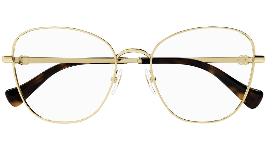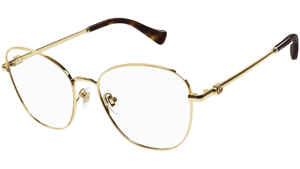 Occhiali da vista Gucci linea GG Logo modello GG1418O 001 in metallo oro endura lucido con aste color oro e lenti demo.