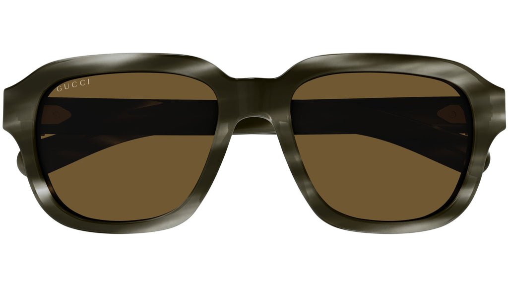 Occhiali da sole Gucci linea Web modello GG1508S rettangolari in acetato riciclato codice colore 003 avana grigio striato lucido con aste tartaruga e lenti color marrone tinta unita.