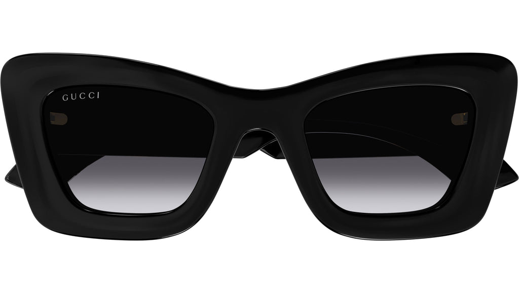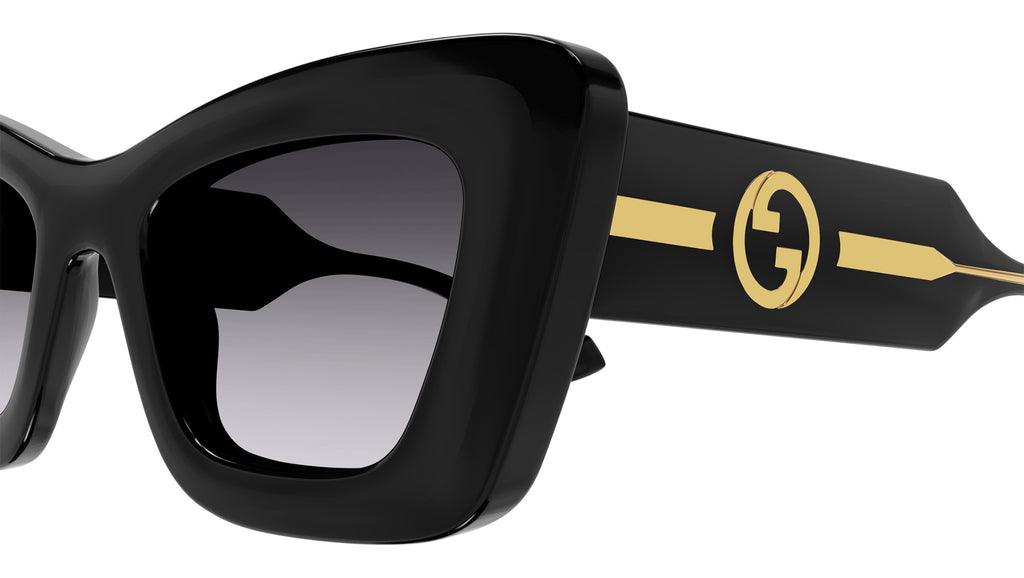 Occhiali da sole Gucci linea GG Logo modello GG1552S cat eye in iniettato codice colore 001 nero lucido con aste cristallo trasparente e lenti color grigio sfumato.