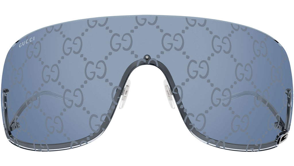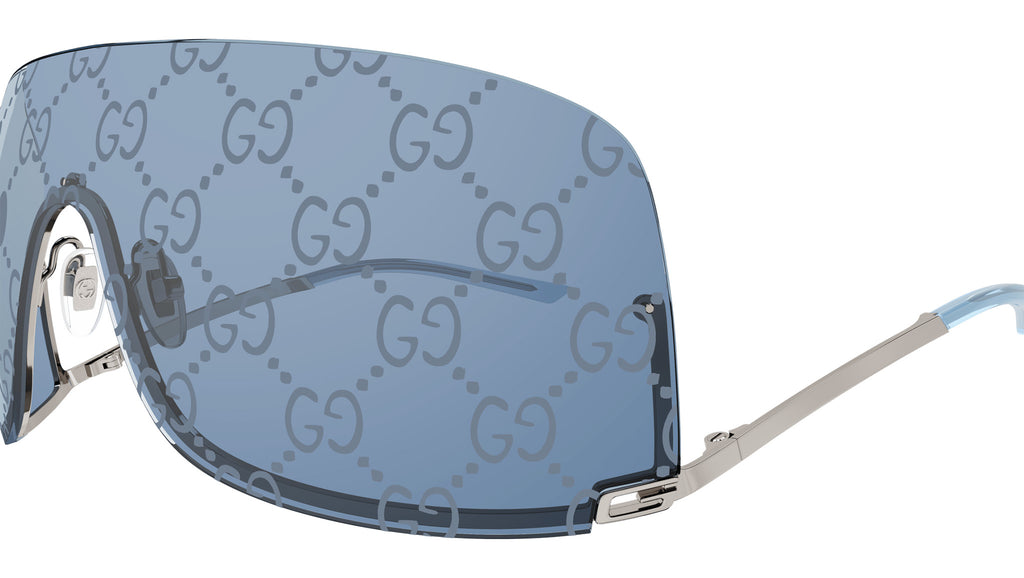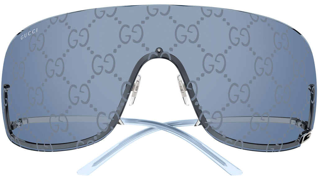 Occhiali da sole Gucci linea Fashion modello GG1560S mascherina in metallo codice colore 003 grigio chiaro trasparente lucido con aste grigio e lenti color blu solido + Guccissima pattern.