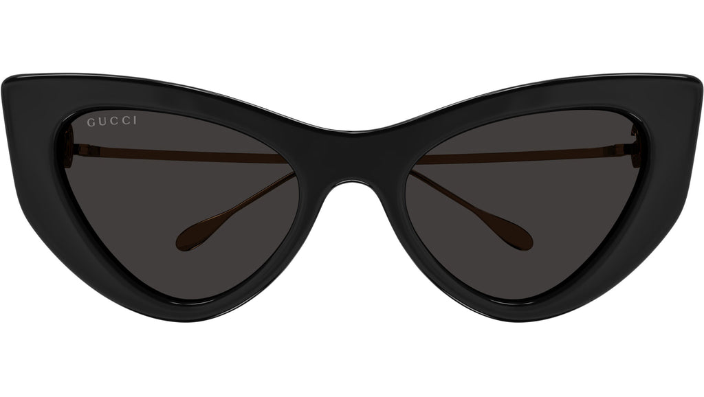 Occhiali da sole Gucci linea Fork modello GG1565S cat eye in iniettato codice colore 001 nero lucido tinta unita con aste oro e lenti color grigio tinta unita.