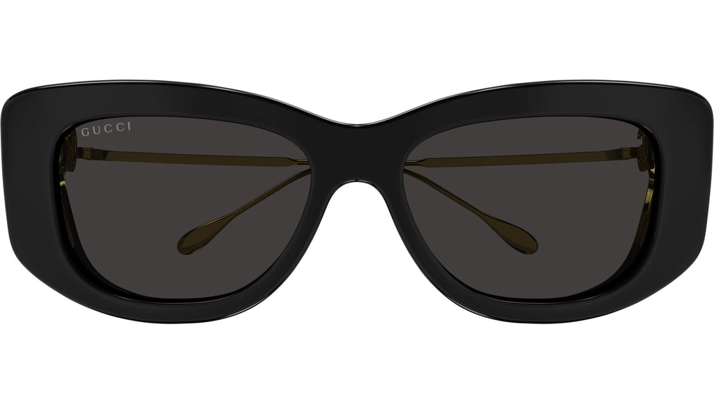 Occhiali da sole Gucci linea Fork modello GG1566S rettangolari in iniettato codice colore 001 nero lucido con aste oro e lenti color grigio tinta unita.