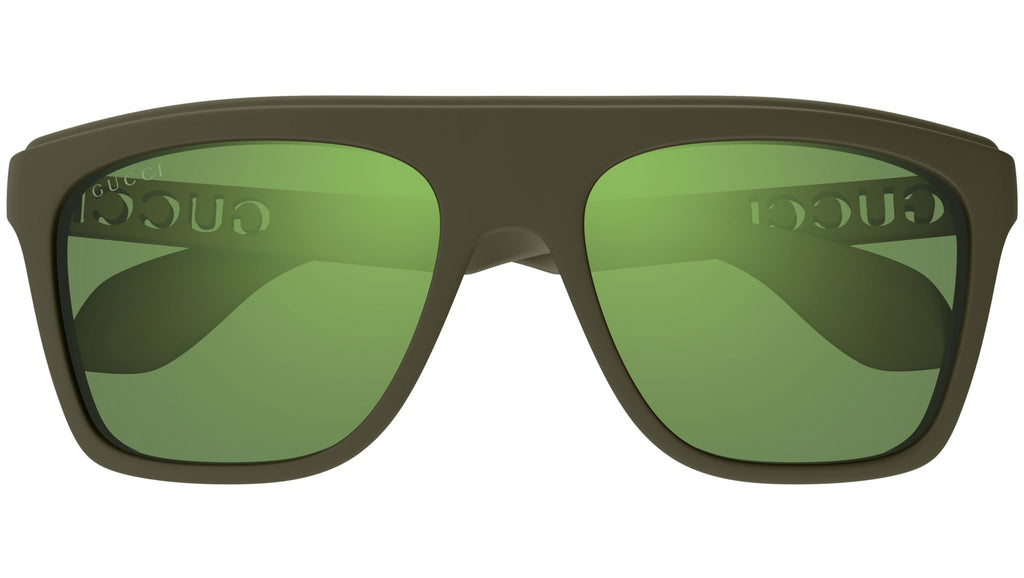 Occhiali da sole Gucci linea Lettering modello GG1570S rettangolari in iniettato codice colore 005 verde scuro solido opaco con aste verde e lenti color verde solido / flash elettrico.