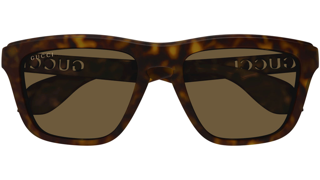 Occhiali da sole Gucci linea Lettering modello GG1571S rettangolari in iniettato codice colore 002 avana scuro opaco con aste tartaruga e lenti color beige nicotine tinta unita.