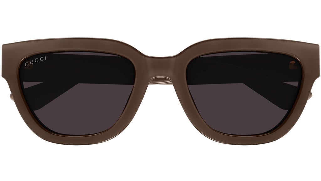 Occhiali da sole Gucci linea GG Logo modello GG1578S cat eye in iniettato codice colore 003 marrone opalino lucido con aste marrone e lenti color viola prugna solido.