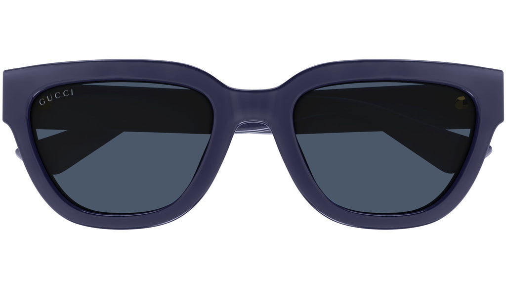 Occhiali da sole Gucci linea GG Logo modello GG1578S cat eye in iniettato codice colore 004 blu viola opalino lucido con aste viola e lenti color grigio blu tinta unita.