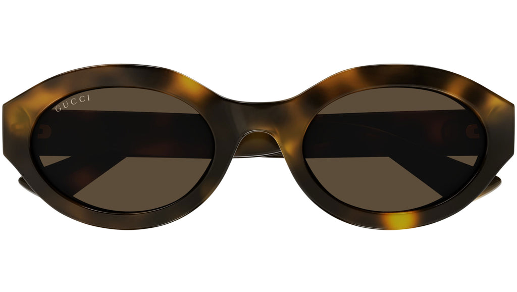 Occhiali da sole Gucci linea GG Logo modello GG1579S geometrici in iniettato codice colore 002 beige avana lucido con aste tartaruga e lenti color marrone scuro tinta unita.
