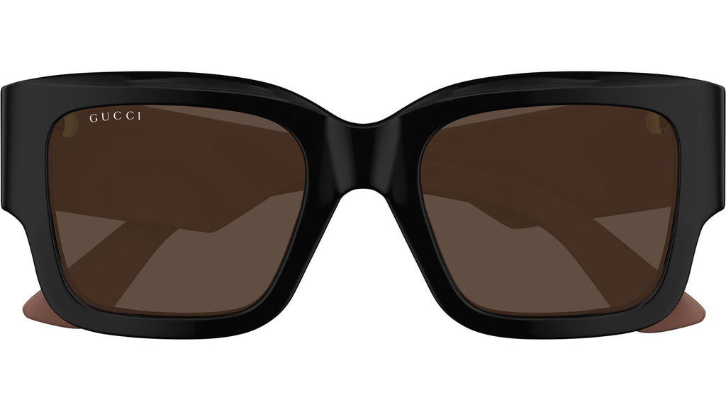 Occhiali da sole Gucci modello GG1663S linea GG Logo in acetato riciclato forma rettangolare codice colore 004 nero lucido con aste rosa e lenti marrone tinta unita. Rivenditore autorizzato Gucci online. Gli occhiali vengono consegnati con custodia e accessori originali e sono coperti dalla garanzia ufficiale di 12 mesi del produttore.