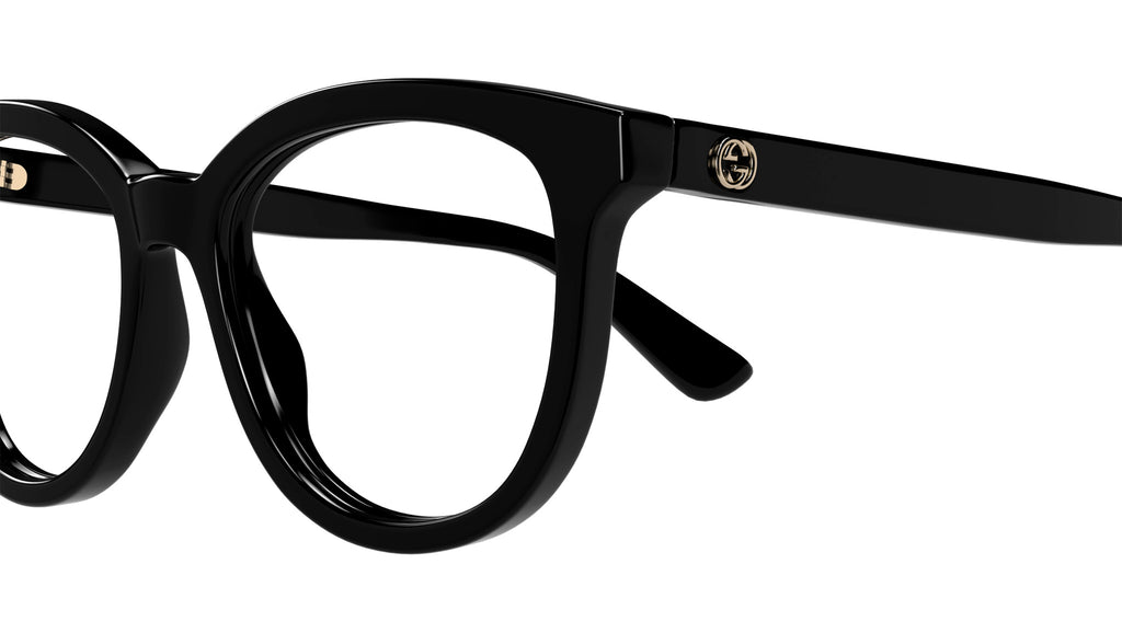 Occhiali da vista Gucci modello GG1687O linea GG Logo in acetato riciclato forma a gatto codice colore 001 nero lucido con aste in nero e lenti demo. Rivenditore autorizzato Gucci online. Gli occhiali vengono consegnati con custodia e accessori originali e sono coperti dalla garanzia ufficiale di 12 mesi del produttore.