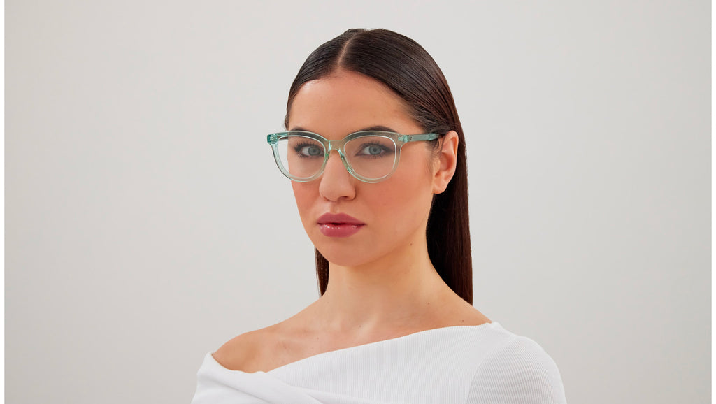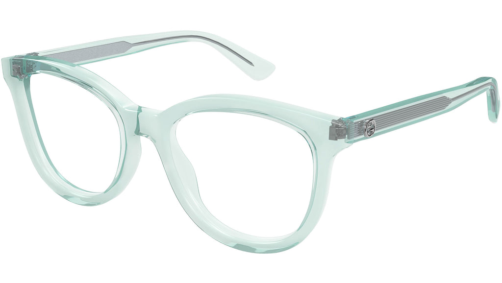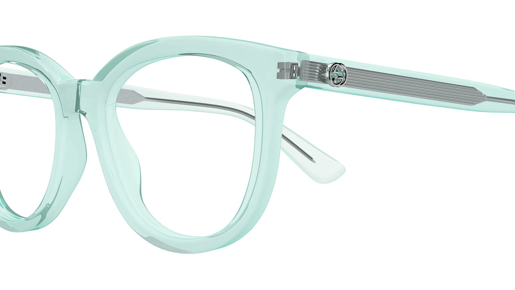 Occhiali da vista Gucci modello GG1687O linea GG Logo in acetato riciclato forma a gatto codice colore 004 verde menta trasparente lucido con aste in verde e lenti demo. Rivenditore autorizzato Gucci online. Gli occhiali vengono consegnati con custodia e accessori originali e sono coperti dalla garanzia ufficiale di 12 mesi del produttore.