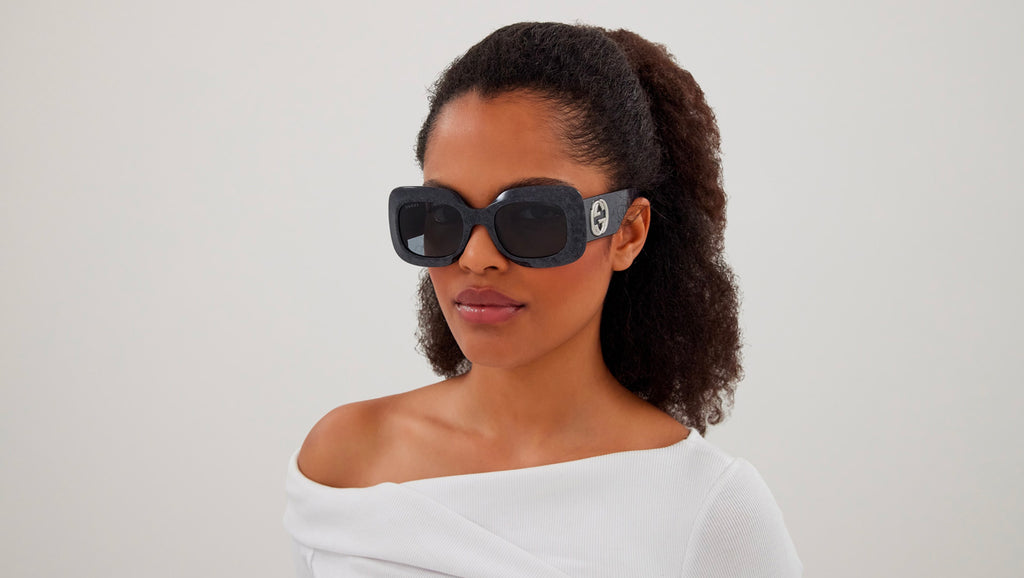 Occhiali da sole Gucci modello GG1695S linea GG Logo in acetato riciclato forma rettangolare codice colore 003 blu notte scuro lucido glitter cosmic con aste nero e lenti grigio chiaro tinta unita. Rivenditore autorizzato Gucci online. Gli occhiali vengono consegnati con custodia e accessori originali e sono coperti dalla garanzia ufficiale di 12 mesi del produttore.