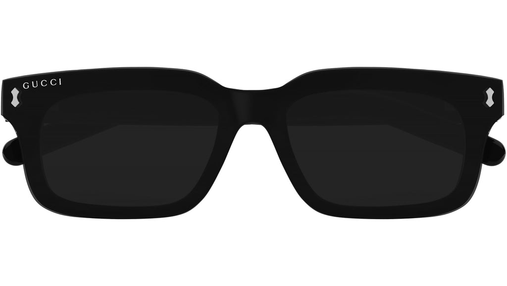Occhiali da sole Gucci modello GG1711S linea Rivets in acetato riciclato forma rettangolare codice colore 001 nero lucido tinta unita con aste nero e lenti trasparente + clip grigio fumo su maschera. Rivenditore autorizzato Gucci online. Gli occhiali vengono consegnati con custodia e accessori originali e sono coperti dalla garanzia ufficiale di 12 mesi del produttore.