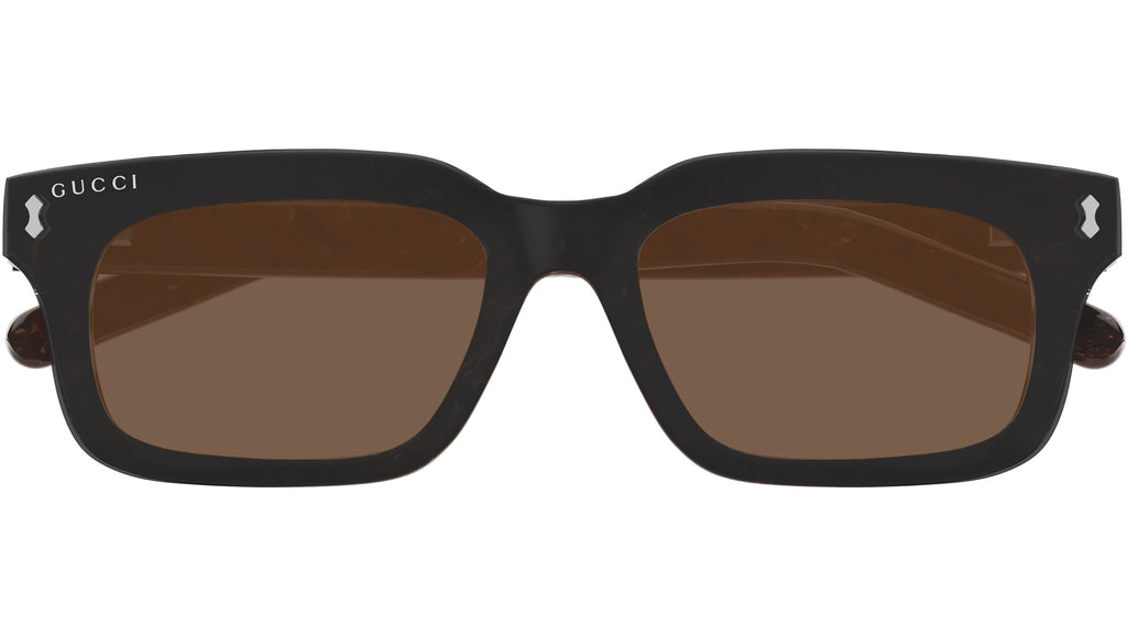 Occhiali da sole Gucci modello GG1711S linea Rivets in acetato riciclato forma rettangolare codice colore 003 marrone radica scuro lucido con aste marrone e lenti trasparente + clip marrone su maschera. Rivenditore autorizzato Gucci online. Gli occhiali vengono consegnati con custodia e accessori originali e sono coperti dalla garanzia ufficiale di 12 mesi del produttore.