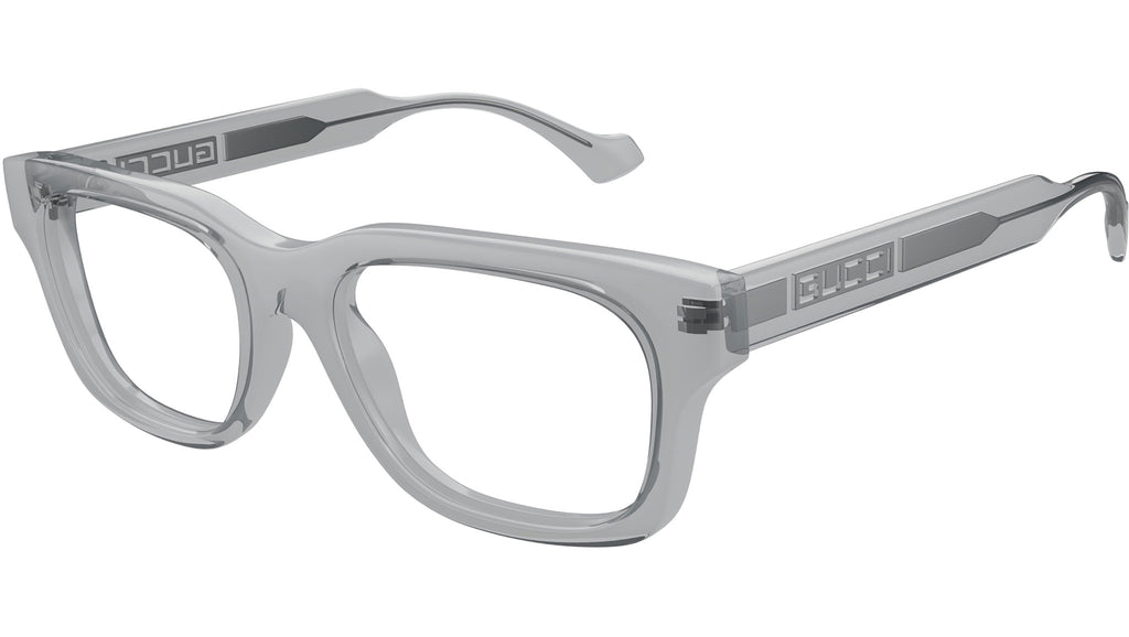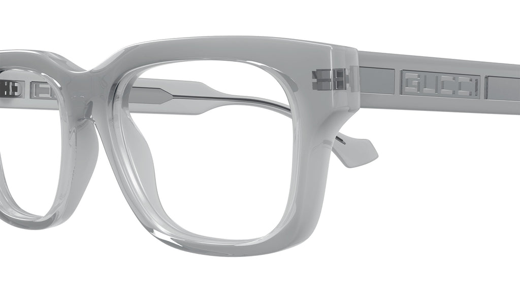 Occhiali da vista Gucci modello GG1731O linea Lettering in acetato riciclato forma rettangolare codice colore 003 grigio nuvola trasparente lucido con aste in grigio e lenti demo. Rivenditore autorizzato Gucci online. Gli occhiali vengono consegnati con custodia e accessori originali e sono coperti dalla garanzia ufficiale di 12 mesi del produttore.