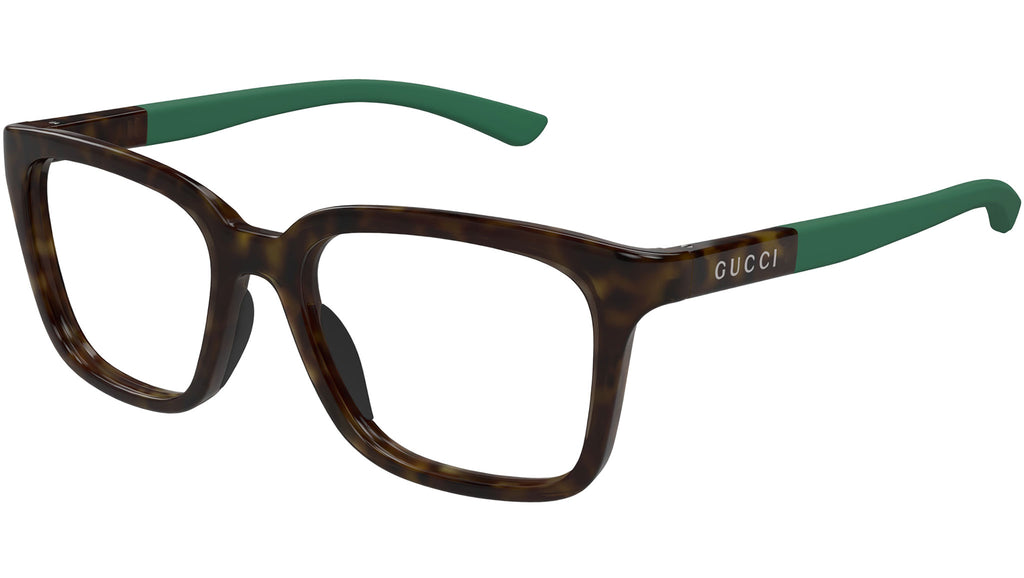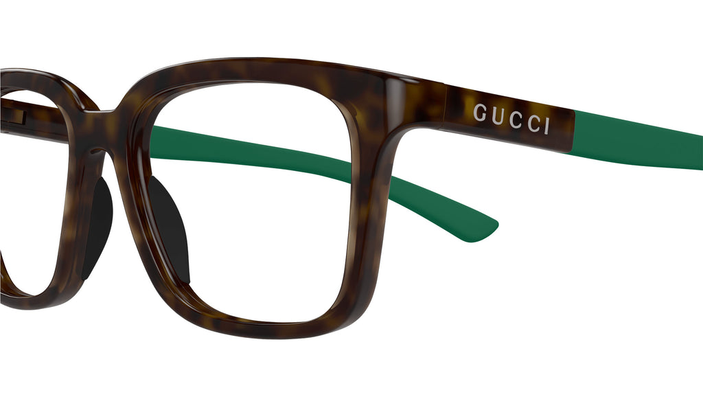 Occhiali da vista Gucci modello GG1738O linea Lettering in iniettato forma rettangolare codice colore 003 tartaruga scuro lucido con aste in verde e lenti demo. Rivenditore autorizzato Gucci online. Gli occhiali vengono consegnati con custodia e accessori originali e sono coperti dalla garanzia ufficiale di 12 mesi del produttore.