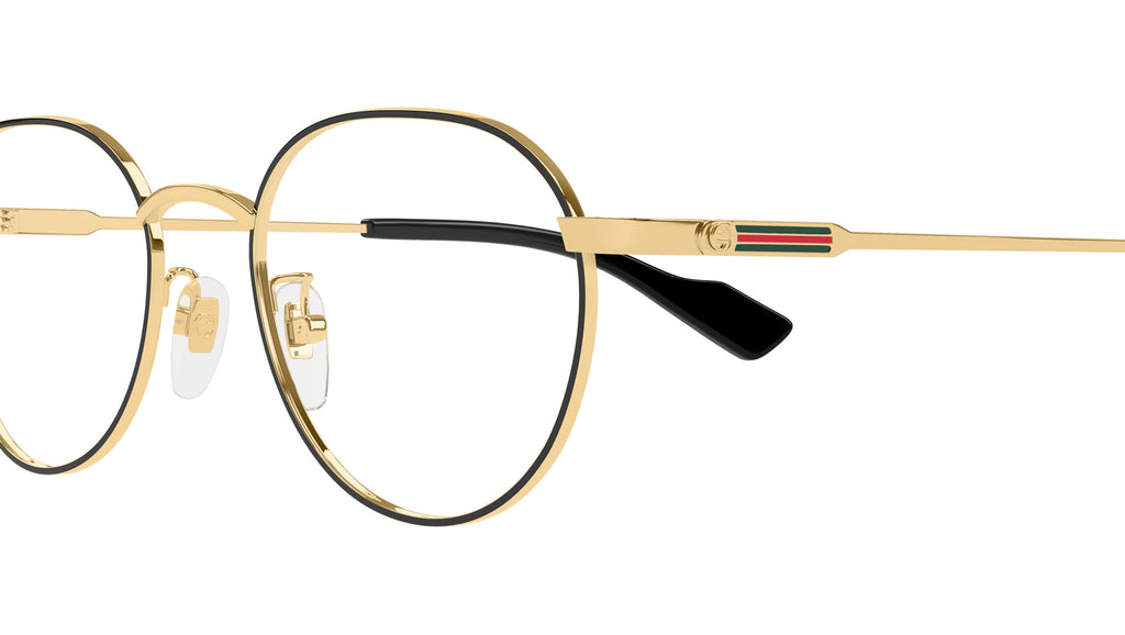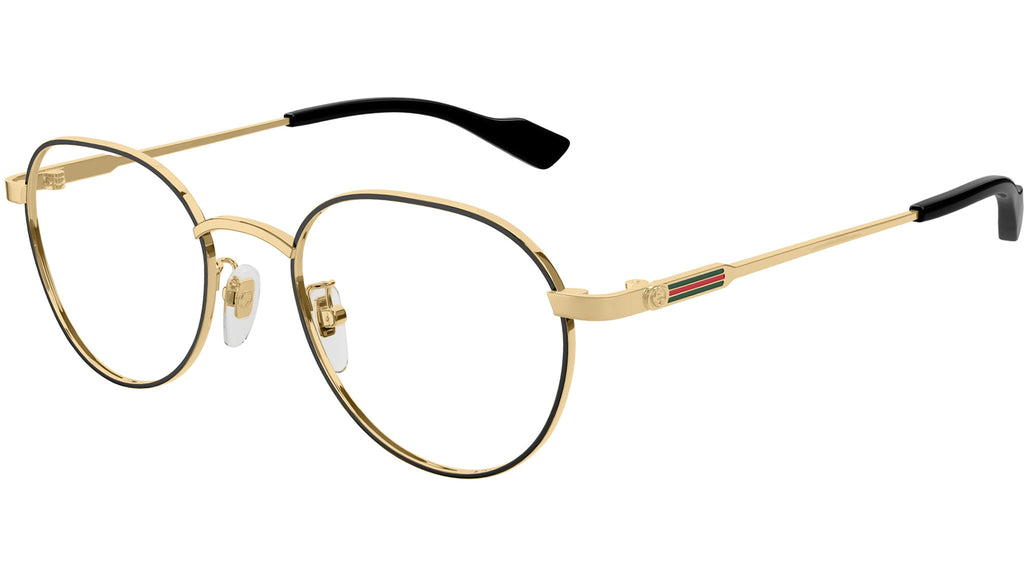 Occhiali da vista Gucci modello GG1747OA linea Lettering in metallo forma pantos codice colore 001 endura oro lucido con 1/3 esterni nero lucido con aste in oro e lenti demo. Rivenditore autorizzato Gucci online. Gli occhiali vengono consegnati con custodia e accessori originali e sono coperti dalla garanzia ufficiale di 12 mesi del produttore.
