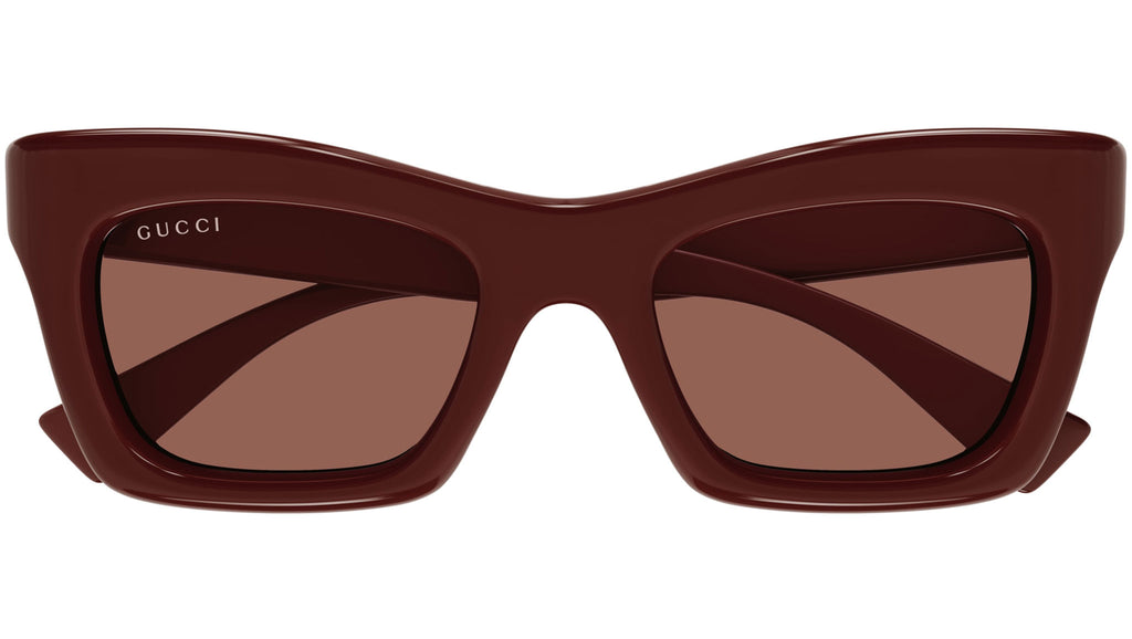 Occhiali da sole Gucci linea modello GG1773S cat eye in acetato riciclato codice colore 003 bordeaux tinta unita lucido con aste rosso borgogna e lenti color marrone caldo tinta unita.